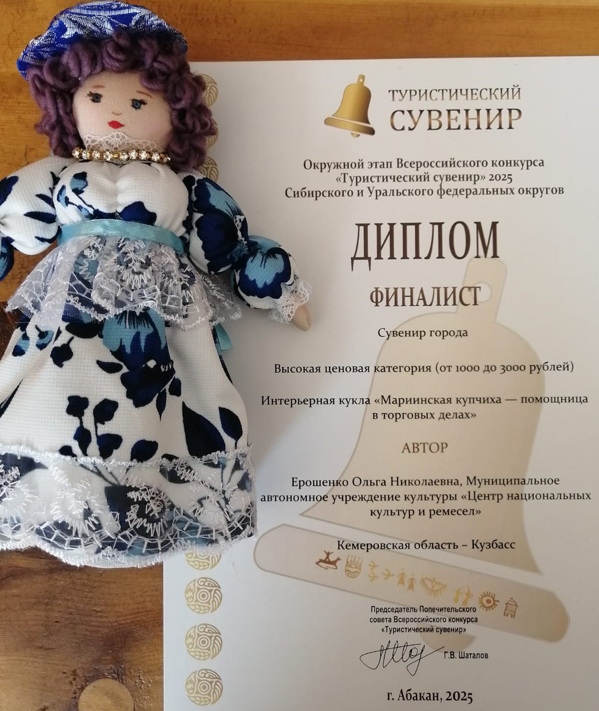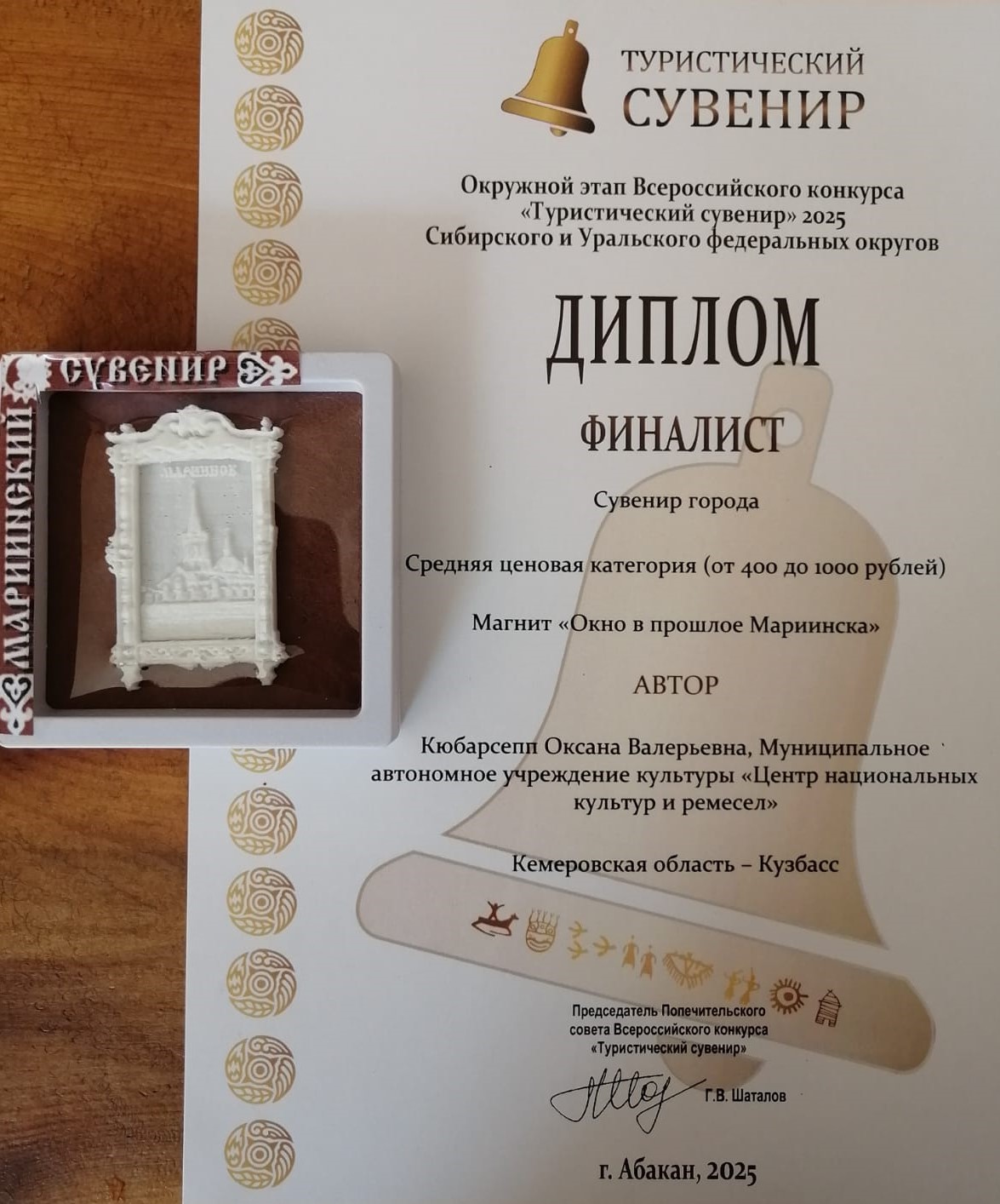 От «Центра национальных культур и ремесел» принимали участие две мастерицы Кюбарсепп Оксана Валерьевна с сувениром-магнитом «Окно в прошлое Мариинска» и Ерошенко Ольга Николаевна с интерьерной куклой «Мариинская купчиха – помощница в торговых делах». Участницы награждены дипломами финалиста в номинации Сувенир города.